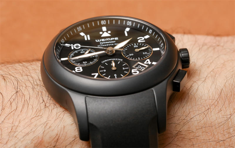 黑色陶瓷表壳有多大区别?首先让我说,Zeitmeister Aviator Ceramic Chronograph reference WM60 0003 有一个姊妹型号,即参考 WM60 0004,采用钢制。与陶瓷表壳的 44 毫米宽直径相比,钢壳型号在 42 毫米宽处也稍小一些。这些手表具有相同的表盘和机芯,不过钢制 Zeitmeister Aviator Chronograph 配备鳄鱼皮表带,而这款陶瓷表款配备运动型表壳黑色橡胶表带和折叠钢展开装置。那么陶瓷有多大的不同呢?我觉得我有点。精钢表款具有非常传统但柔软的手感(得益于圆形表壳),