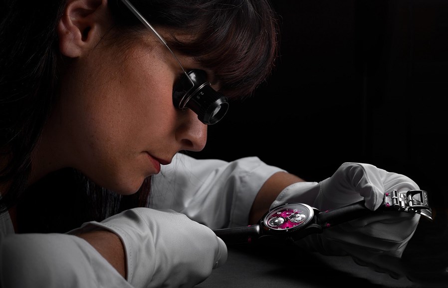 1858系列南北半球世界时腕表 粉色表盘特别版(孤品)由万宝龙女性制表师精心组装,采用象征抗击乳腺癌的粉色,搭配对比鲜明的深黑色调,独具设计美学。值得一提的是,该款孤品表背特别镌刻落日下粉色勃朗峰的立体景观,“Pièce Unique”(孤品)字样以及“粉色表盘”慈善项目(The Pink Dial Project)标志,不仅充分体现了万宝龙源自1858年的纯正制表基因,更因支持抗击乳腺癌慈善项目而独具内涵。