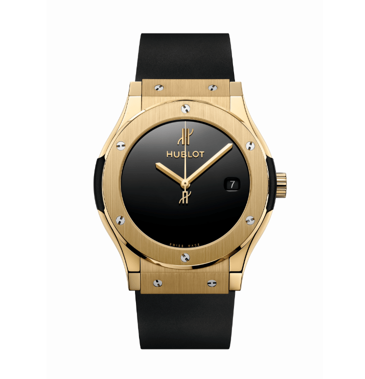 表款采用机械机芯,巧妙融合了制表传统与科技创新,呈现启古纳今的广博风范。黑色漆面及抛光表盘尽显低调简约风范,仅以黑色抛光琢面指针及“Hublot”与“H”镶贴标志点缀。表壳直径45毫米,由黄金、钛金属或黑色陶瓷打造而成,搭配采用品牌标志性螺丝设计的表圈与蓝宝石镜面表背,搭配易于调节的橡胶表带散发出经久不衰的魅力,并配以三折式折叠式表扣,进一步提升了佩戴舒适性。这些设计细节为首枚宇舶表注入了现代气息,赋予这些腕表杰作隽永的独特美感。