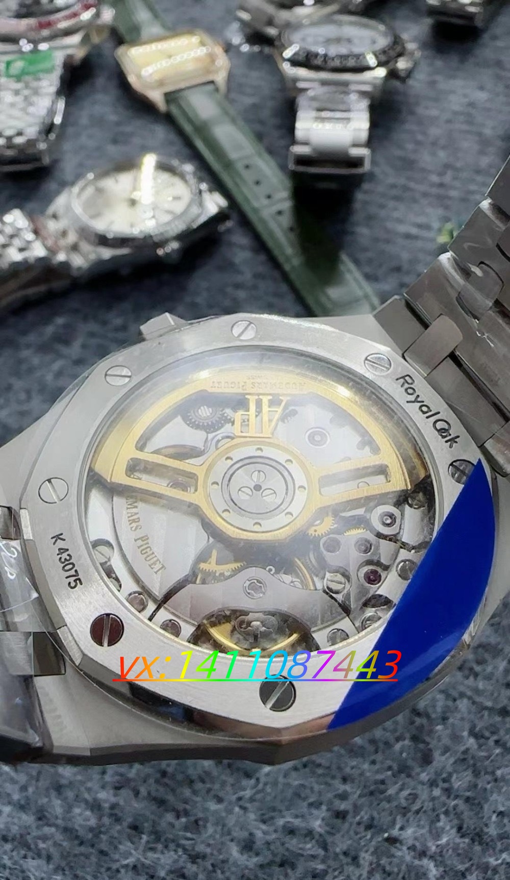 表带采用拉丝板链条设计,拉丝效果与原厂一致,表节通过螺丝固定,表扣上的 AP 标志清晰,整体打磨细节出色,尽显经典钢王风范。